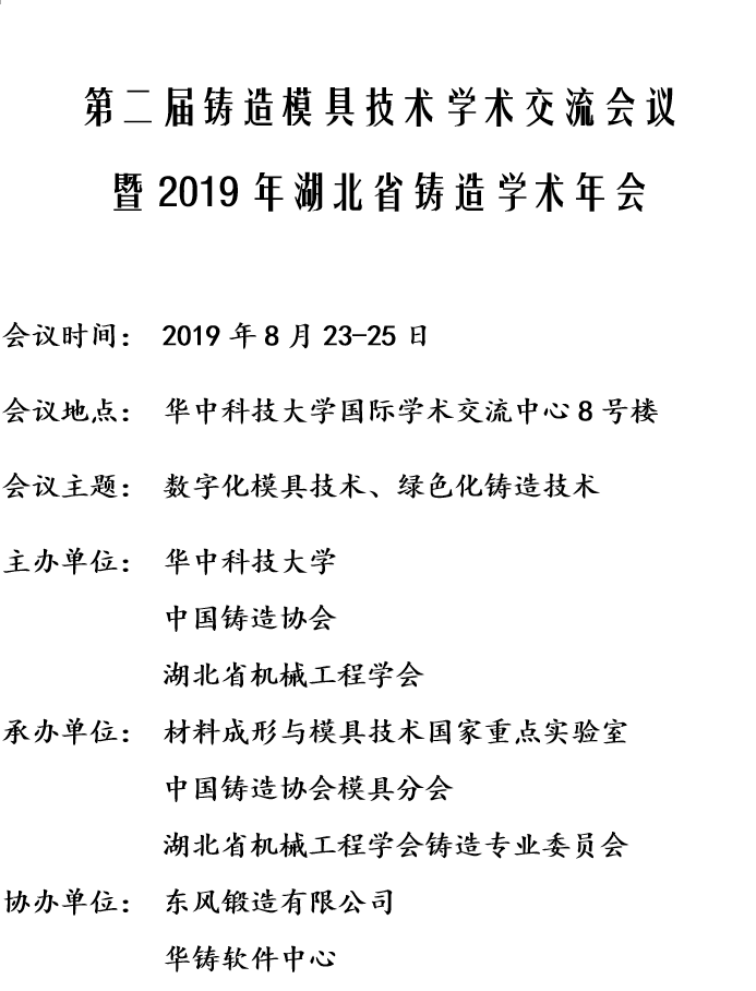 第二届铸造模具技术学术交流会议暨2019年湖北省铸造学术年会会议日程